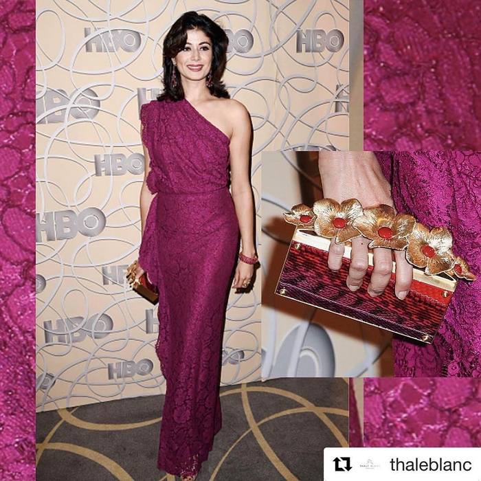 She was seen carrying the Golden Orchid Thale Blanc luxury clutch designed by Deborah Sawaf.